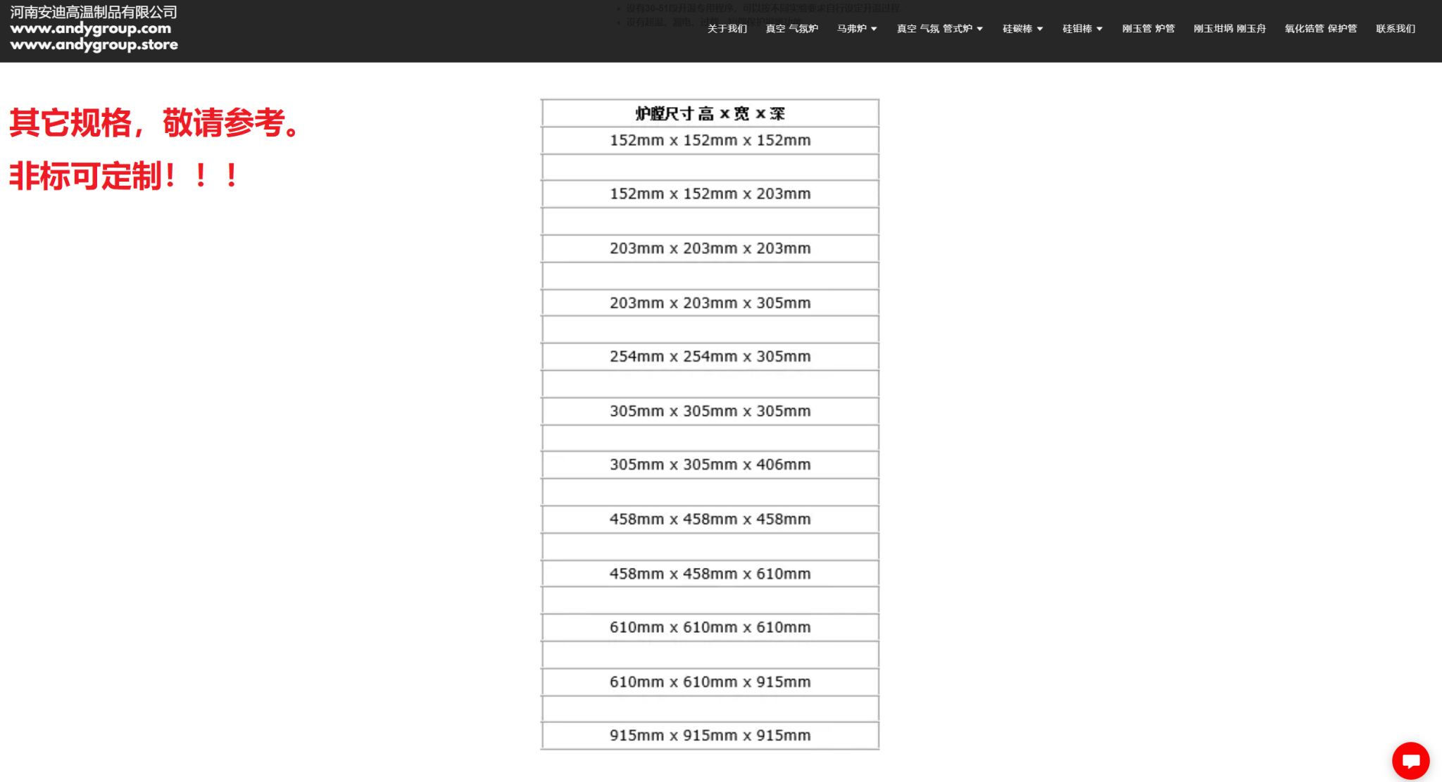型号 | 炉膛尺寸 高 x 宽 x 深 | 最高温度 (C) | 持续炉膛温度 (C) |
